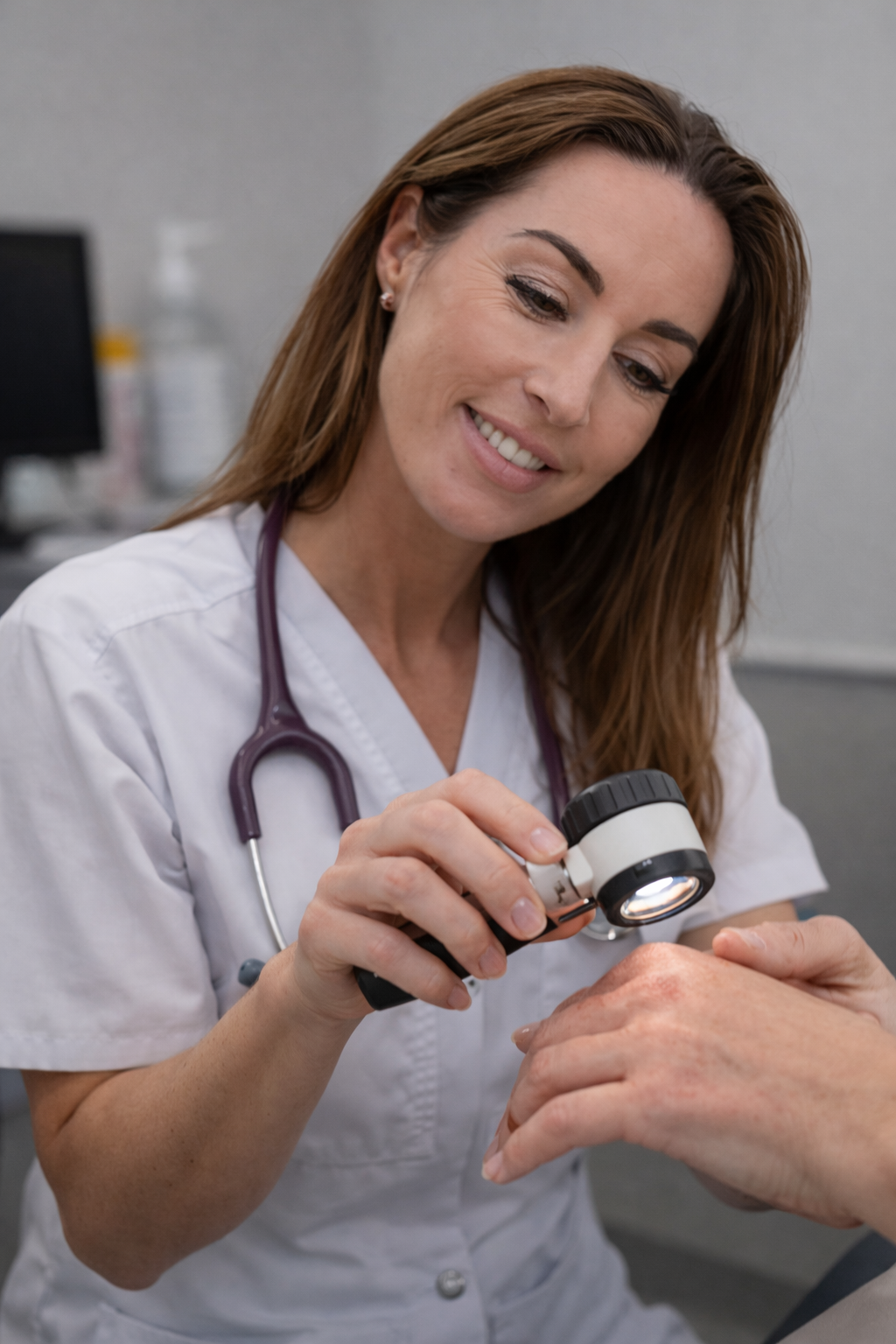 Tijdens het huidspreekuur maakt de assistente een foto van één verdacht plekje met een dermatoscoop. Dit is een speciaal apparaat met verlichting en vergroting waarmee huidplekken gedetailleerd vastgelegd kunnen worden. De foto wordt via Ksyos doorgestuurd naar een dermatoloog, die de beoordeling uitvoert. Zo krijgt u altijd een deskundig advies.